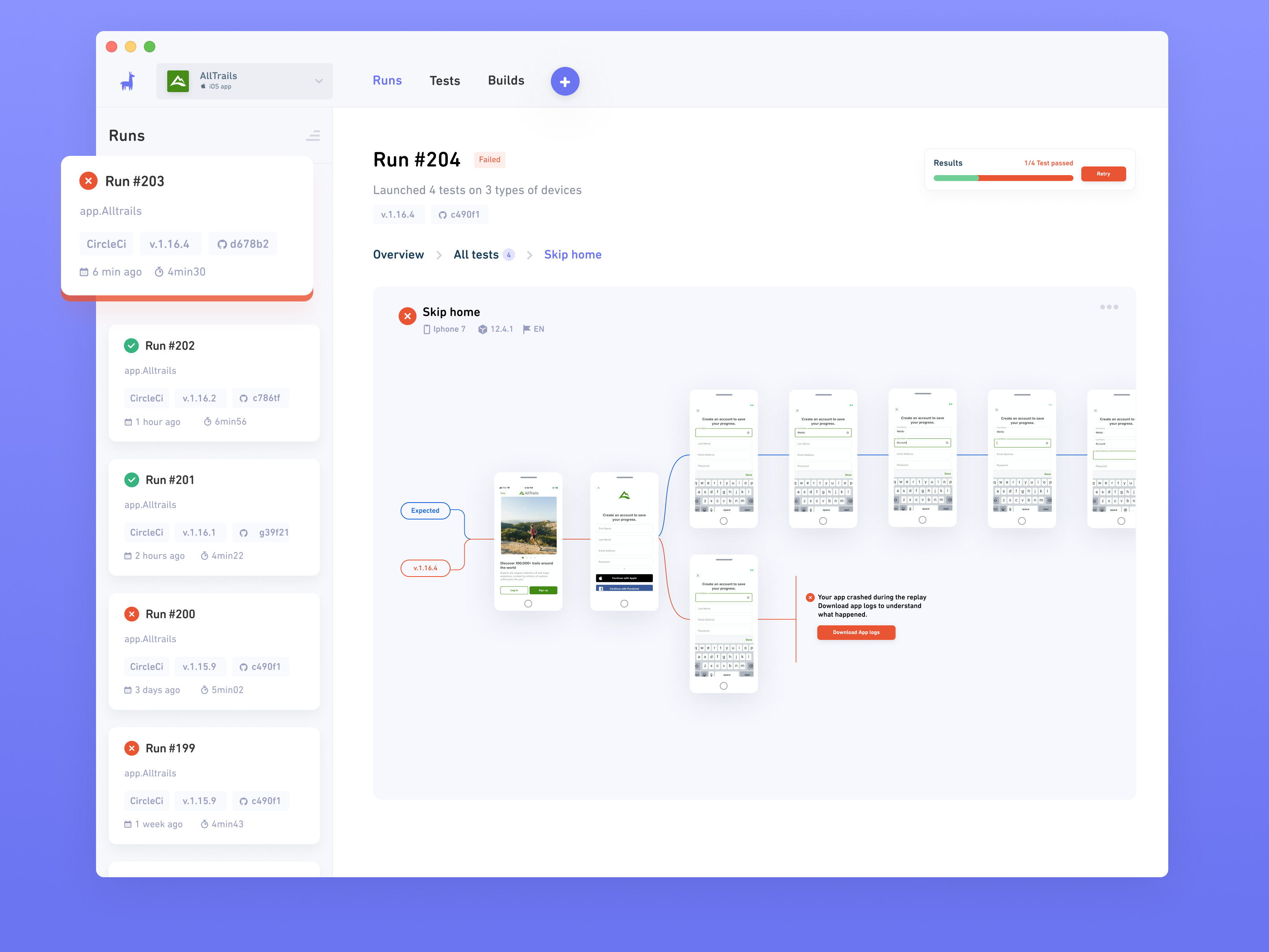 When you’re done recording your tests, Waldo keeps them for future versions. Every time you have a new build of your mobile app, Waldo runs the same tests on that new version. In addition to that, Waldo can run those tests on other devices with different screen sizes, older versions of mobile operating systems and in different languages.