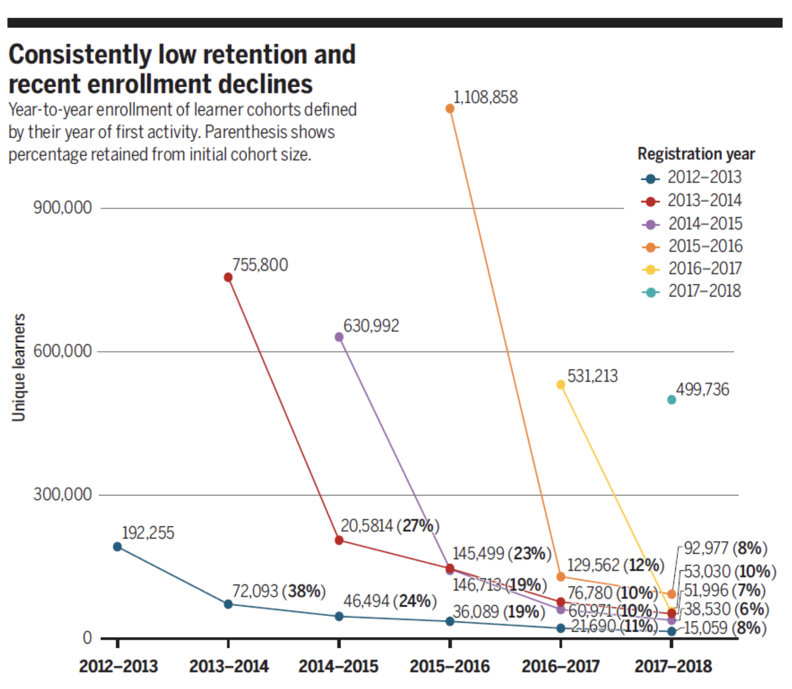 It’s no surprise that the completion rates for courses on MOOCs have been low and on a decline. A study conducted by MIT researchers analyzed edX course data of over 5 million learners from MIT and Harvard between 2012 and 2018. The study found that the completion rates for verified and all participants ranged between 46%-56% and 3%-4% respectively, and had declined in recent years despite the efforts on research and platform development.
