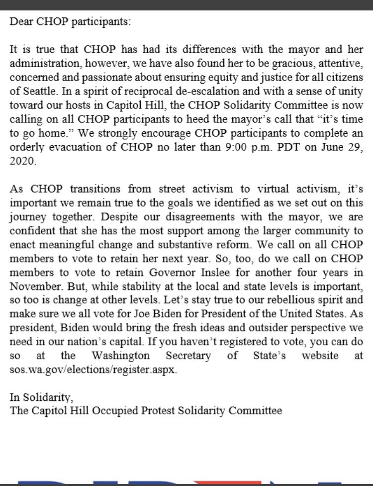 Later, when attempting to provoke a “mission accomplished”-style early exit from the zone after the Mayor cut $20 million from the police budget, the account exhorted its readers to vote for Biden. Needless to say this was not among the commonly agreed-upon demands or positions of the protests. Unless whoever was behind this strange yet prominent account exposes themselves, we may never know if it was a government plant, an agent provocateur or a practical joker, or what their intentions really are.