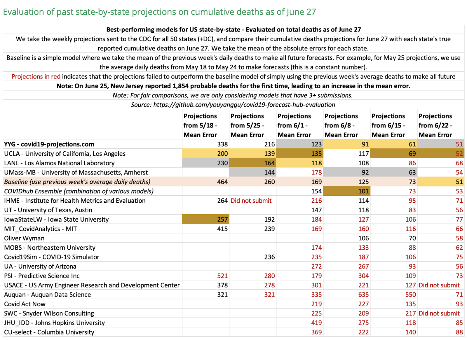The chart below shows the ranked performance of the best-performing models, based on predictions of cumulative deaths for June 27 as a national aggregate of state-by-state predictions, made by each model during preceding weeks.