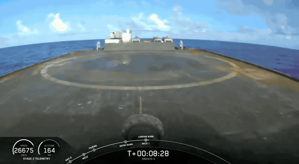 The Falcon 9 carrying the ANASIS-II lifted off from Cape Canaveral in Florida at 5:30 PM EDT (2:30 PM PDT) on Monday, using a first-stage booster that SpaceX flew less than two months ago — on the Demo-2 mission that carried NASA astronauts Bob Behnken and Doug Hurley to the International Space Station. This is a record in terms of the time required to recover a booster and turn it around for re-use — breaking the 63-day time of the booster used for Starlink’s fourth production launch in February.