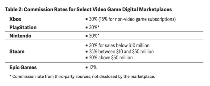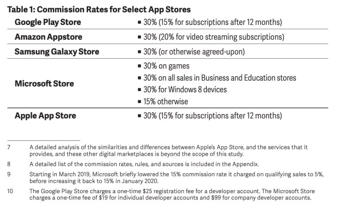 This study points out that most app stores and video game marketplaces have the same commission structure as Apple’s (30%). This includes the Google Play Store, Amazon Appstore, Samsung Galaxy Store, Microsoft Store, plus game marketplaces across Xbox, PlayStation, Nintendo and Steam platforms (Steam is 30% for sales below $10 million). Some stores drop the 30% commission rate in specific cases — for example, Steam drops it for higher sales; Amazon charges 20% commissions on video streaming subscriptions; Xbox charges 15% for nongame subscriptions, and so on.