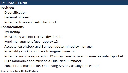 At the end, usually seven or more years out, each investor receives a basket of stocks. They pay zero tax if they hold the stocks forever, but if you sell, your aggregate cost basis is equal to the cost basis of the original shares contributed. Some downsides of using exchange funds to consider are lockups, expenses and sometimes not achieving the desired level of diversification. Below I detail some high-level positives and considerations.