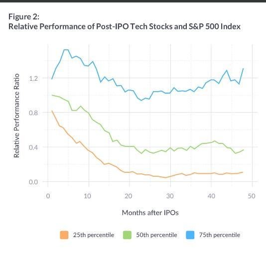 These findings are also consistent with the underperformance of IPO stocks relative to the S&P 500, as reported by Professor Jay Ritter, an academic authority on IPOs. If you’d like to dig deeper like I do, you can download his full data set here.