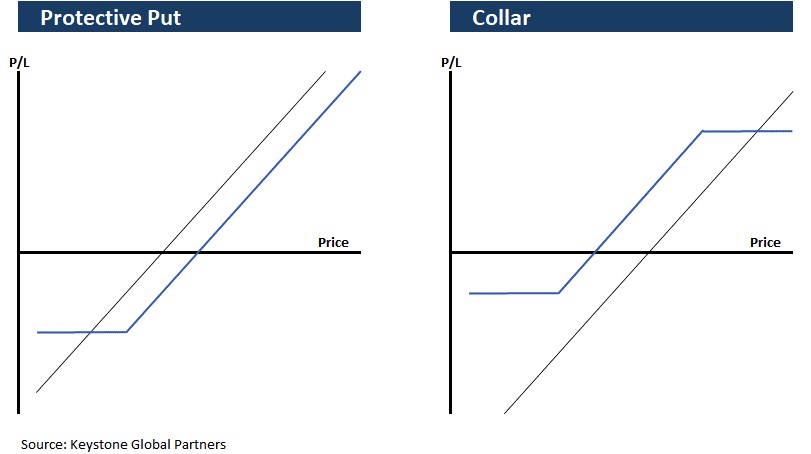 Hedging with options — Multiple hedging strategies can be implemented to protect your downside; however, some of the more common approaches used are the protective put and the protective collar. Below are basic examples of how these strategies are executed, for illustrative purposes.