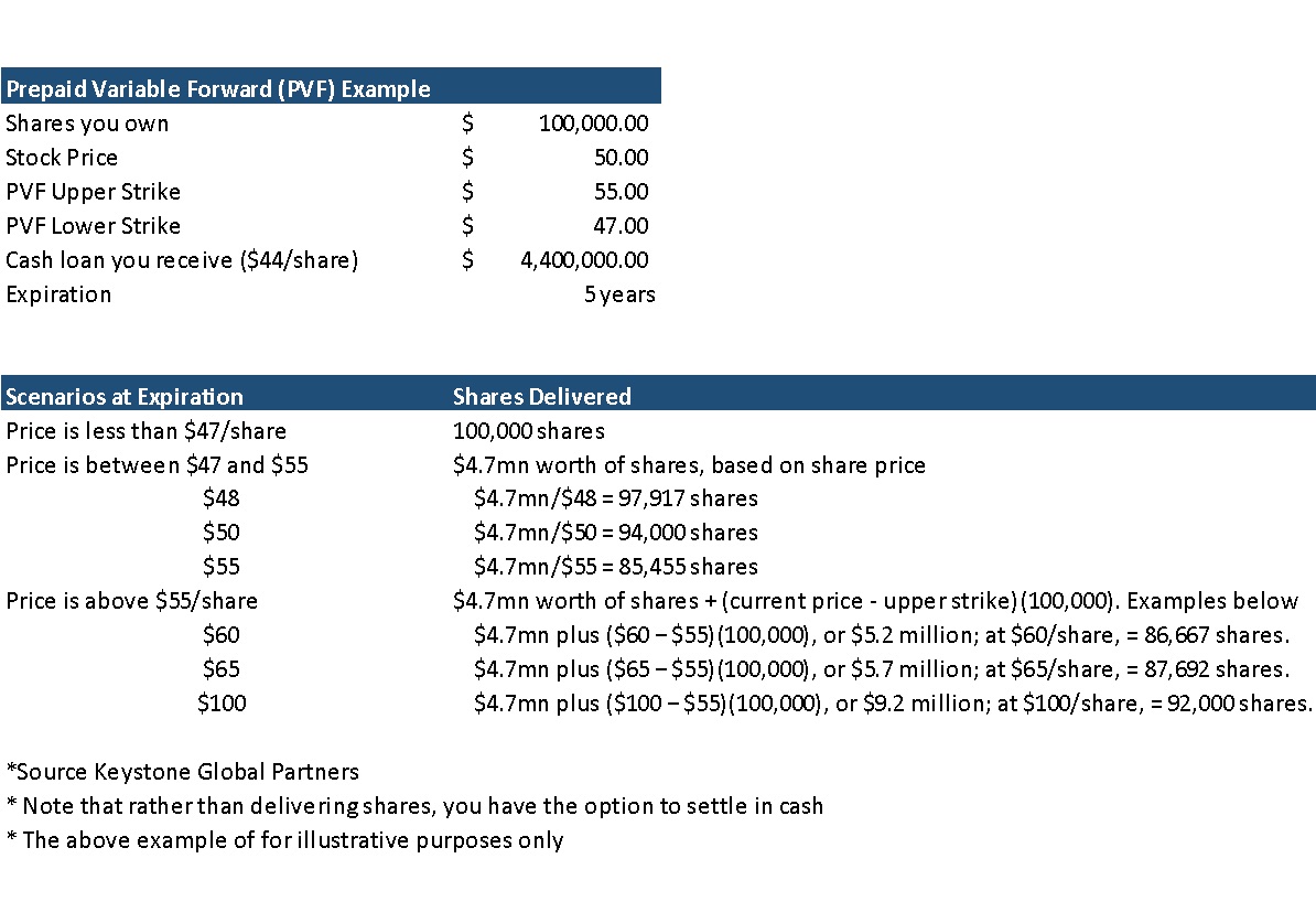 Prepaid variable forward contract: This strategy enables a shareholder to synthetically diversify their equity exposure by entering into an agreement (contract) with a bank or brokerage firm to receive a loan now and sell their stock at a future date. The reason it is “variable” is because the amount of stock the shareholder delivers in the future depends on share value upon expiration. The shareholder can also decide in the future to cash-settle (deliver cash) instead of delivering (selling) stock.