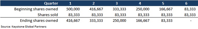 As an example, a founder might plan to sell 500,000 shares over 18 months. The founder is comfortable selling quarterly, which equals six selling periods of 83,333 shares per quarter. In a scenario where a founder is subject to blackout periods, a 10b5-1 trading plan can be implemented and set on autopilot. The company may even allow you to sell your shares during blackout periods with a 10b5-1 trading plan. See the example of scheduled selling below.