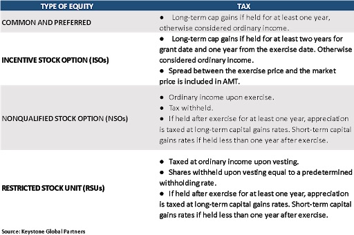 How you own your stock and how long you have owned it will ultimately determine how you are taxed. Below is a chart showing the different types of taxation on various forms of equity compensation.