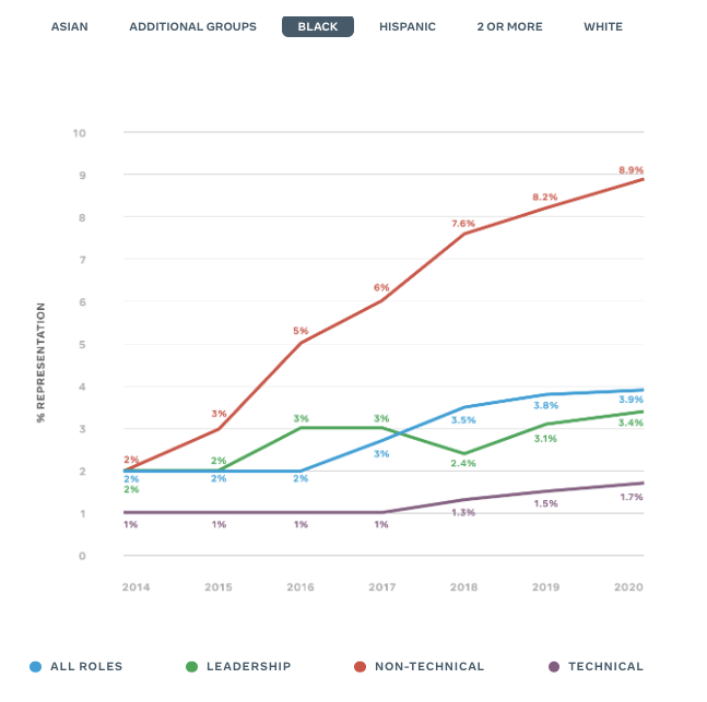 Black representation in technical roles has barely budged since 2014, when Black people represented 1% of employees in technical roles compared to just 1.7% in 2020. Facebook has found most success increasing the representation of Black folks in non-technical roles, which tend be lower-paying than their technical and leadership counterparts.