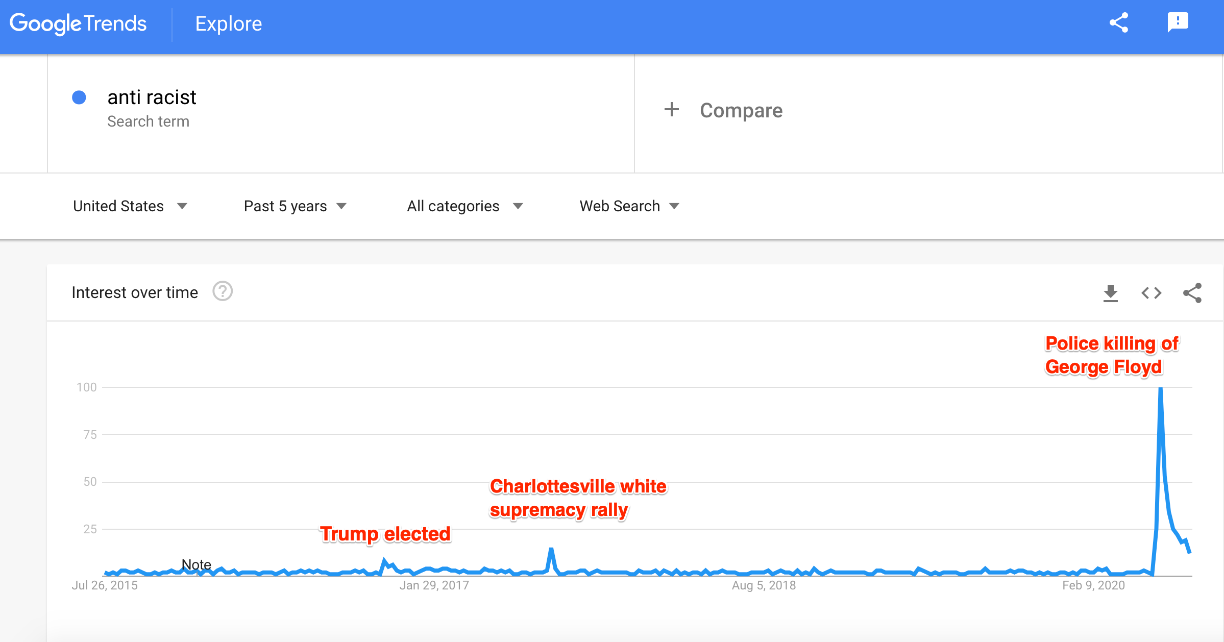 Related: This past year marked the most interest in anti-racism in the last five years, according to Google Search Trends.