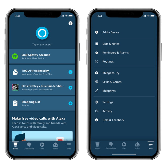 Instead of showcasing popular skills on the home screen, as before, the app’s “Skills & Games” section has been shuffled off to the “More” tab. Amazon’s first-party experiences, like shopping, media playback and communications, now take up this crucial home screen real estate.