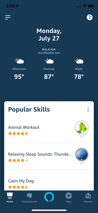 Before, the app had featured the date and weather at the top of the screen — an indication that Amazon had hoped the app would be something of a daily dashboard. (See below). Now, the company seems to understand that users will launch the app when they want to do something Alexa-specific. That’s why it’s making it easier to get to recent actions, so they can effectively pick up where they left off on whatever they were doing on their Echo smart speaker, for example.