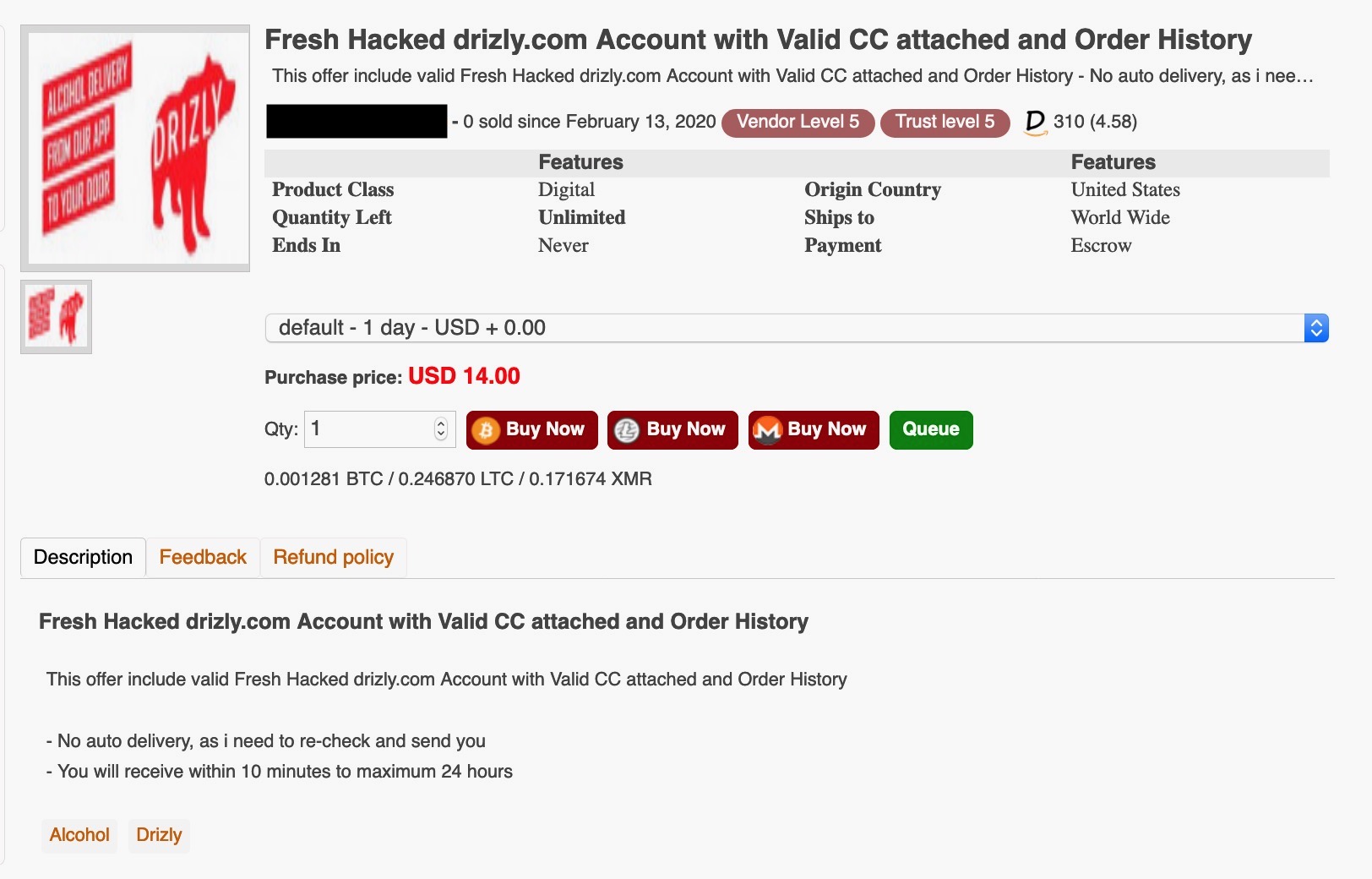 The listing, which we are not linking to, claims to have “Fresh Hacked” [sic] Drizly accounts. The data is on sale for $14, at the time of writing. The seller did not say when the breach took place, but the listing appears to have been posted on February 13. Although no sample of data was offered, the listing claims to have valid Drizly credit card numbers and users’ order history.