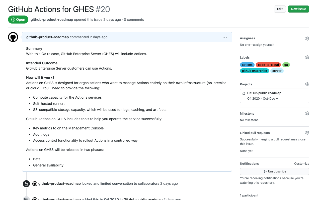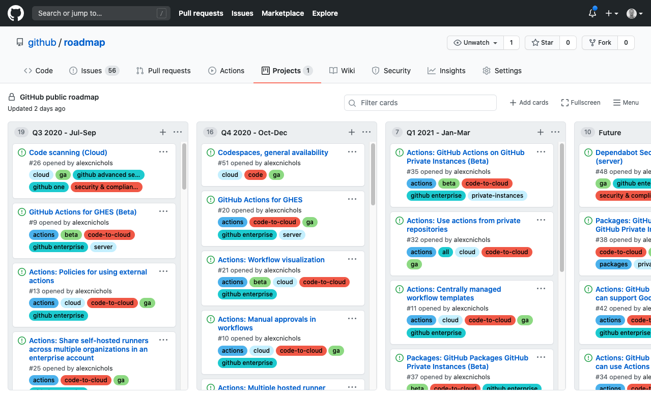 Unsurprisingly then, the roadmap lives in a GitHub repo. Everything will be tagged based on the feature, the product it affects and its development stage. Over time, GitHub plans to attach more artifacts to every item, including screenshots, for example.