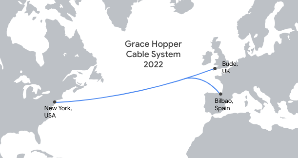 Google today announced its plans to build a new subsea cable with landing points in New York in the U.S. and Bude, U.K. and Bilbao, Spain in Europe. The new cable, named after the pioneering computer scientist Grace Hopper, will join Google’s various other private subsea cables like Curie between the U.S. and South America, Dunant between the U.S. and France and Equiano between Europe and Africa.