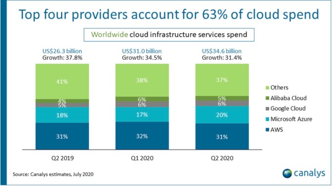 Canalys has slightly different numbers, breaking it down into dollars spent, with Amazon at 37%, Microsoft at 20% and Google at 6%.