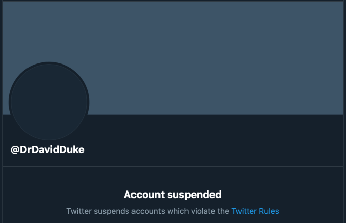Duke had operated freely on its platform for years — amassing a following of around 53,000 and recently tweeting his support for president Trump to be re-elected. Now his @DrDavidDuke account page leads to an ‘account suspension’ notification (screengrabbed below).