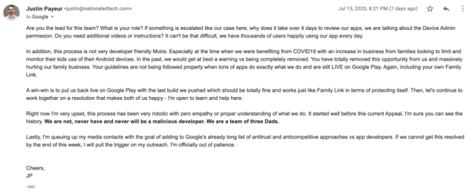 On July 8th, Boomerang received a reply from Google with more information, explaining that Google doesn’t allow apps that change the user’s device settings or features outside the app without user’s knowledge or consent. Specifically, it also cited the app’s use of the “Google Accessibility Services API” in a manner that’s in violation with the Play Store terms. Google said the app wouldn’t be approved until it removed functionality that prevented a user from removing or uninstalling the app from their device. (Boomerang had used the API for several years for blocking WebView, reporting YouTube watch history, web filtering in Chrome, and blocking access to disabling the Boomerang service — Google’s main problem with the app.)