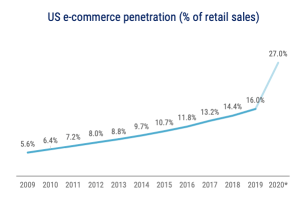 The same CB Insights report details a key “tailwind” factor for many fintech startups, namely that e-commerce is booming in the COVID-19 era, rising from about 16% of total U.S. commerce to around 27% through Q2 of this year.