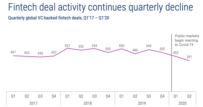 Sadly, all the good news doesn’t trickle down: According to the same CB Insights data set, fintech startups raised 397 funding rounds in Q2 2020, down from 452 in Q1 2020 and 502 in Q4 2019 and 540 in the quarter before.