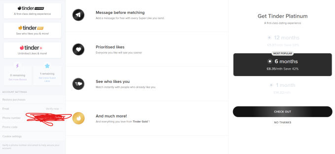According to a U.K.-based Tinder user, the offer for Platinum popped up when they were using Tinder on the web. But they weren’t able to make a purchase, they said.