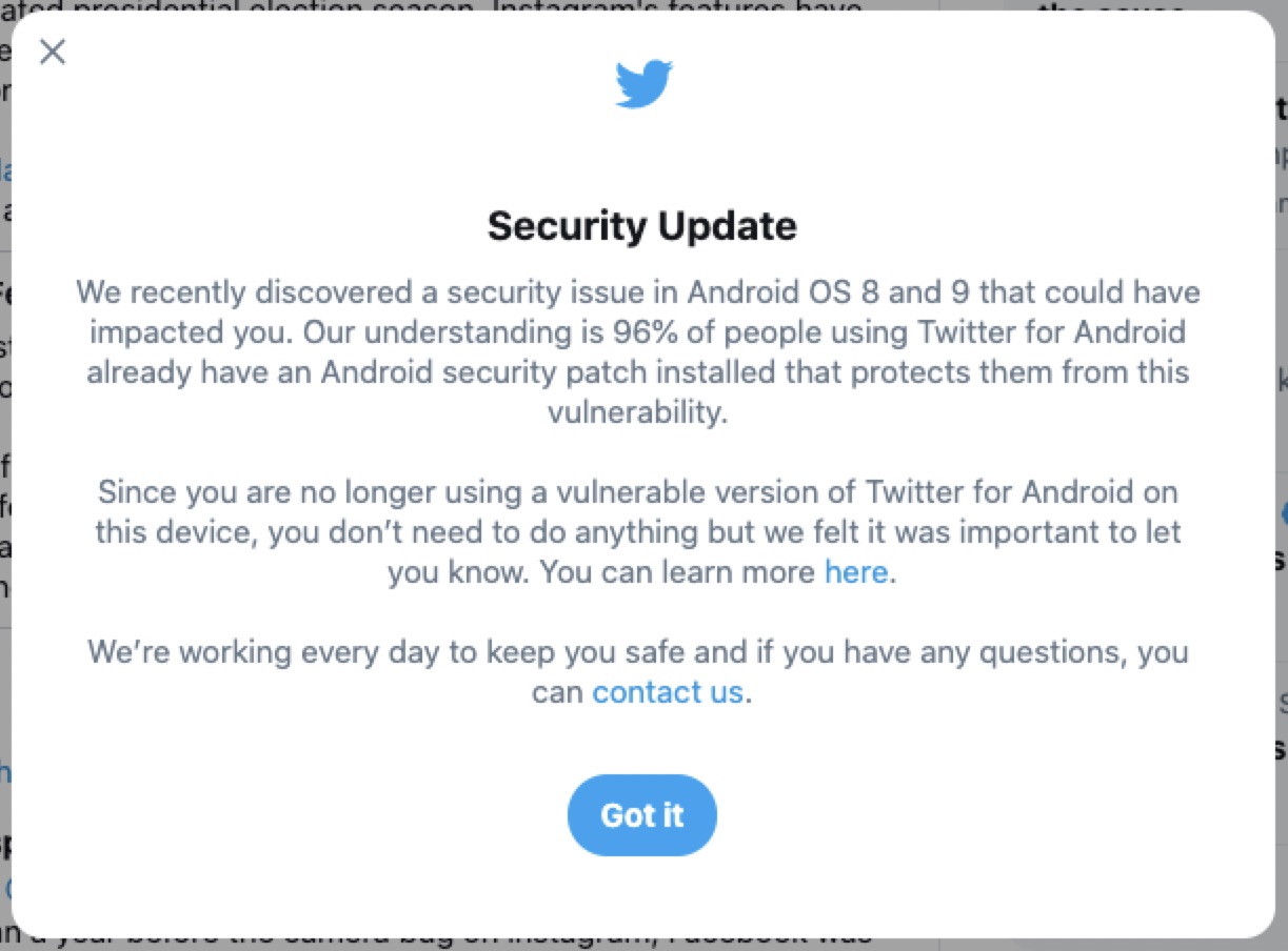 Twitter said the vast majority of users had updated their Twitter for Android app and were no longer vulnerable. But the company said about 4% of users are still running an old and vulnerable version of its app, and users will be notified to update the app as soon as possible.