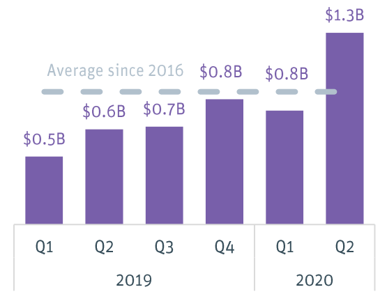 That pace would put edtech funding in Q3 around where it was in Q1, though with reporting delays I’d hazard that it will wind up ahead of its first quarter result. So, edtech funding will be elevated in 2020 compared to 2019, say, but not as sharply as you might have expected merely seeing the charted Q2 result.