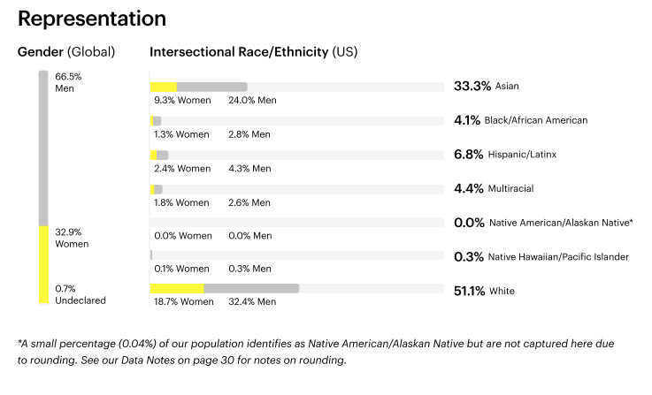 Snap’s numbers are not good, but also nothing out of the ordinary for the tech industry. What’s novel about Snap’s report, however, is the intersectional data breakdown. You’ll note that the representation of Black women (1.3%) is lower than the representation of Black men (2.8%). The same goes for all race/ethnicity categories. Across all distinct races, there are more men than women. Again, this is not good, but it’s to be expected, unfortunately.