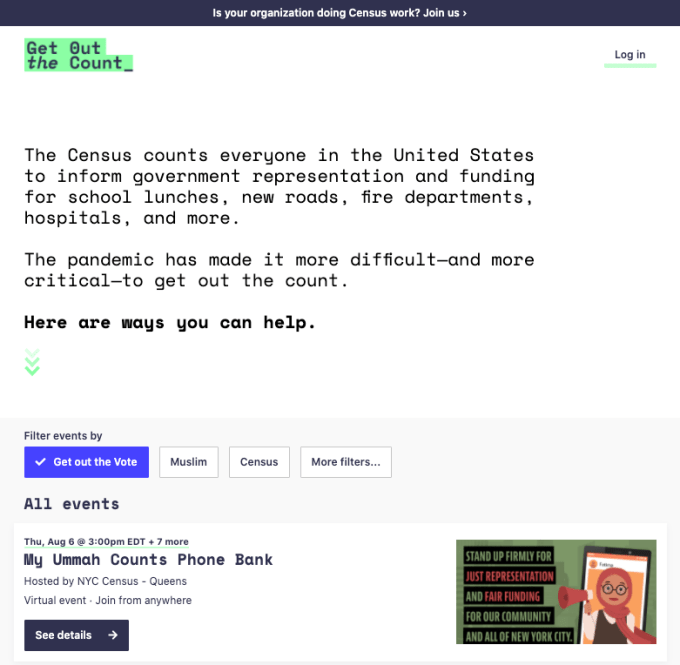 For Mobilize, the crucial final census push is something of a crucible for the platform’s power in a year that’s gone all-digital. Johnson has seen virtual events skyrocket on Mobilize as COVID-19 took root across the U.S. Prior to the pandemic, about a quarter of events were virtual — now they all are.