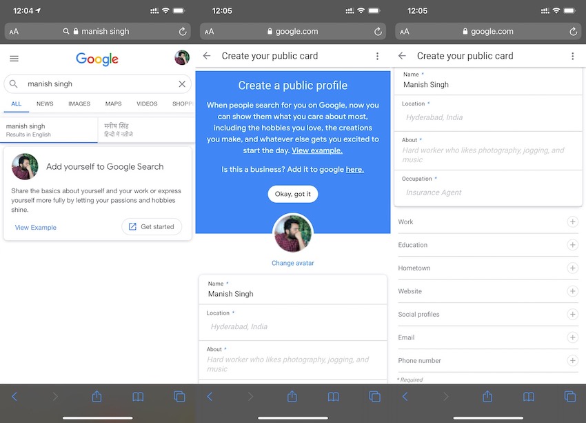 Users can create people cards about themselves by signing into their Google account and then looking up their name on Google search. This will prompt a new option called “add me to Search” or “get started”; tapping this will open a form that asks users to provide a bio (description) of themselves, their picture (by default, Google fetches the image associated with a user’s Google account), links to their website and social media profiles and, optionally, their phone number, address, work and education details, and email address.