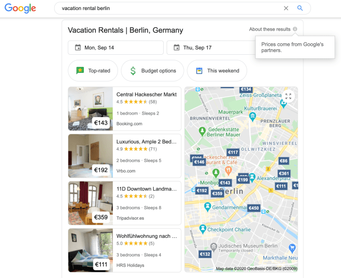 It told us it’s watched with alarm as Google introduced a new ad unit in search results which promotes a vacation rental search and booking experience — displaying property thumbnails, alongside locations and prices plotted on a map — right from inside Google’s platform.