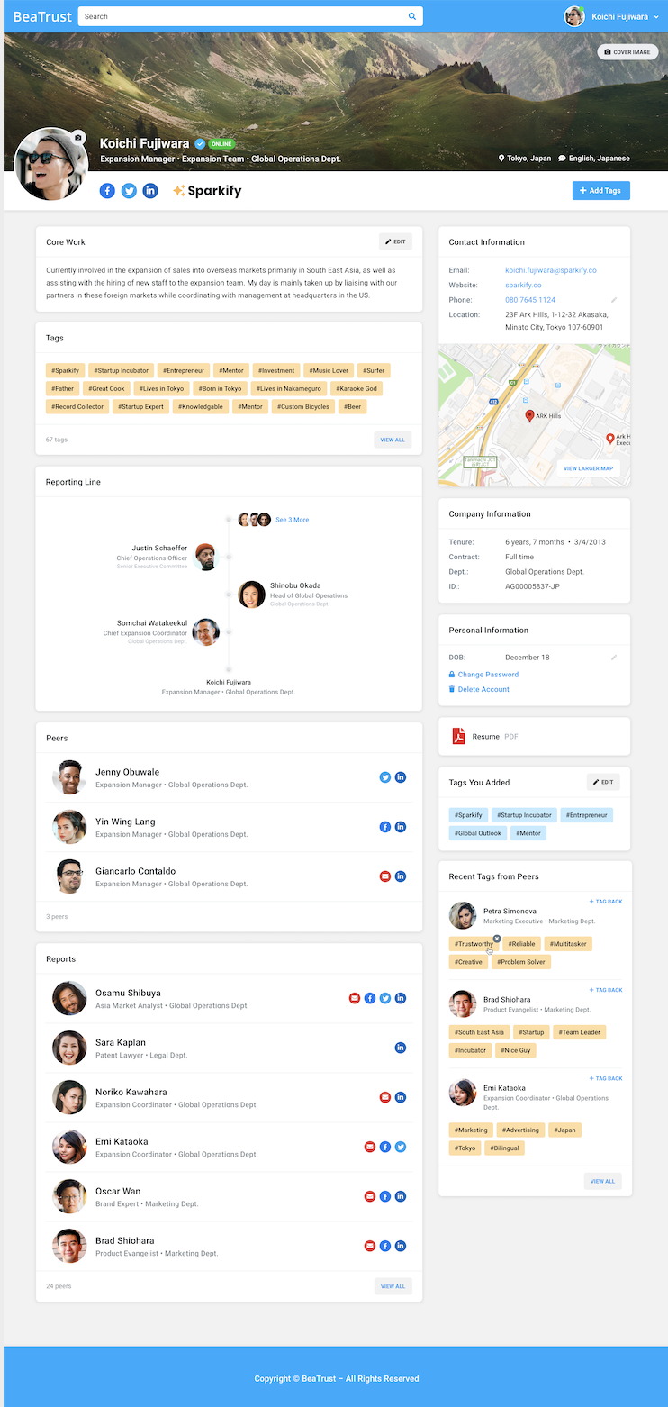 The platform is currently in closed beta stage, testing with three late-stage startups that have about 100 to 200 employees each. Its first feature is employee profiles that list skills and experience. Next, BeaTrust will launch tools for users to visualize how teams at their company are organized and modules to enable collaboration on different kinds of projects, including software development.