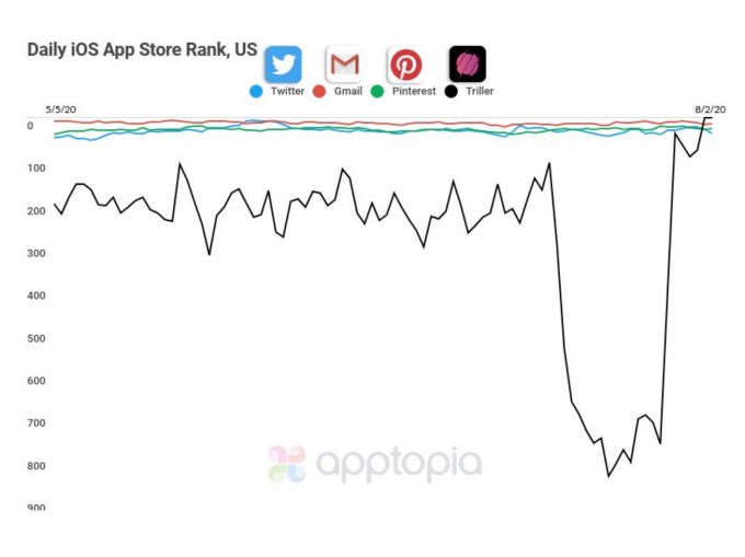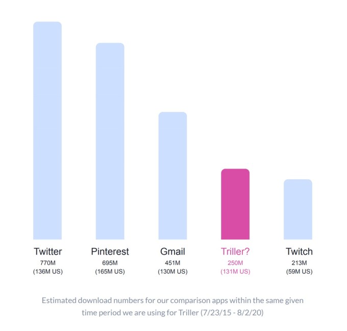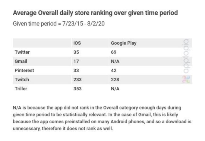 On iOS, the average overall ranking for Gmail during this time period was No. 17, Twitter was No. 35, Pinterest was No. 33 and Twitch was No. 233. Triller, meanwhile, was No. 353. (Twitch is lower than the others because it’s a less-used app, because chart rankings aren’t entirely download-dependent and because many Twitch users stream on the desktop, not mobile. But even it ranks higher than Triller.)