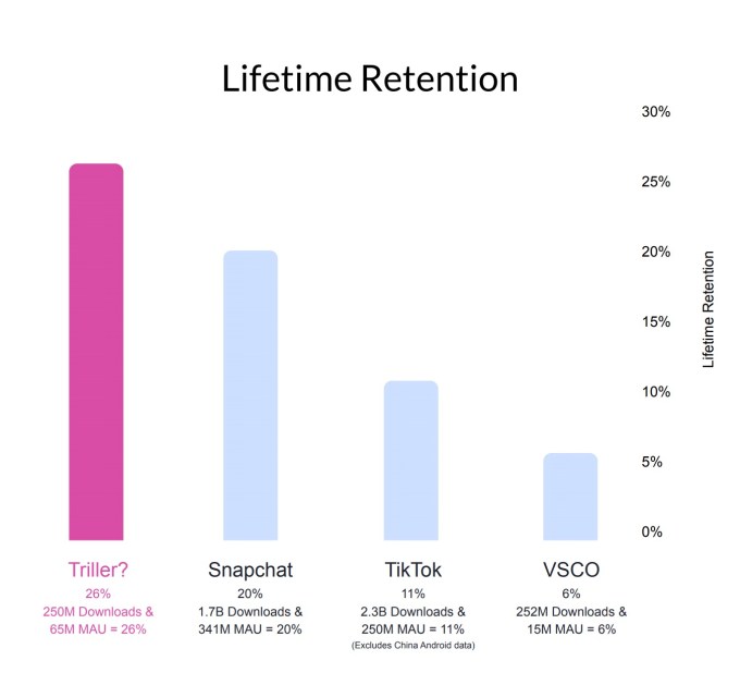 Snapchat has a lifetime retention rate of 20%, for example. TikTok has an 11% lifetime retention rate. Triller’s is higher, based on its own figures.