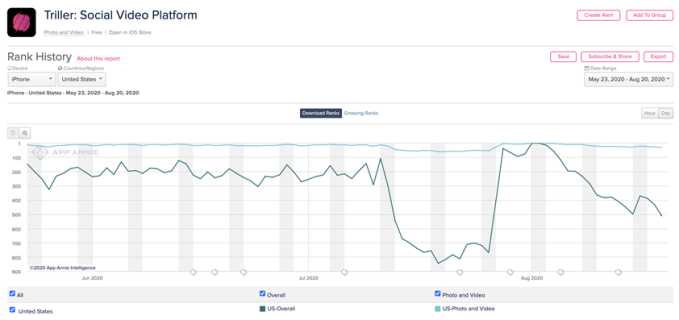 Apptopia’s estimate here is also in line with App Annie’s data. Though App Annie couldn’t pull a lifetime average rank, as Apptopia did, it was able to pull Triller’s average U.S. iPhone App Store Overall rank for the past 90 days, which was No. 303.