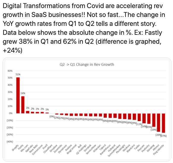 There’s a small error in the Twilio bar, for what it’s worth — Ball publicly noted the slightly unfair comparison given that the telephony API company had acquisition-boosted Q1 revenue growth, making the Q1/Q2 comparison a little unfair — but you can see clearly that most cloud and SaaS companies did not accelerate between Q1 and Q2.