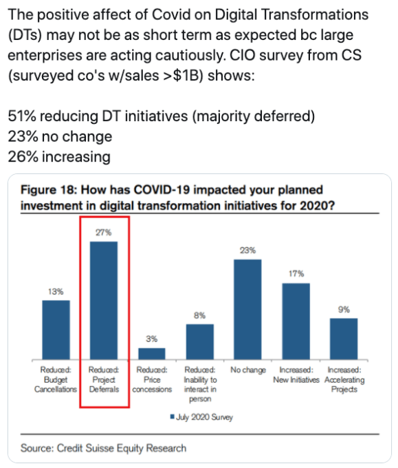 Ball said in our chat that cloud “acceleration might not happen immediately,” adding that it could happen in future quarters because companies are simply being more conservative with their cash during the COVID-19 pandemic than before. The situation could mean that some digital transformation projects are being deferred. That would lead to the data you see above, which is counter-narrative to the more sunny view that you’ll mostly see on Twitter and other social platforms.