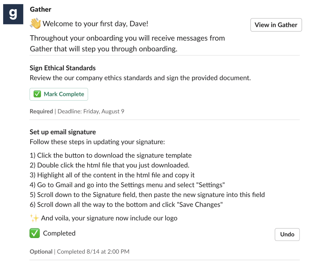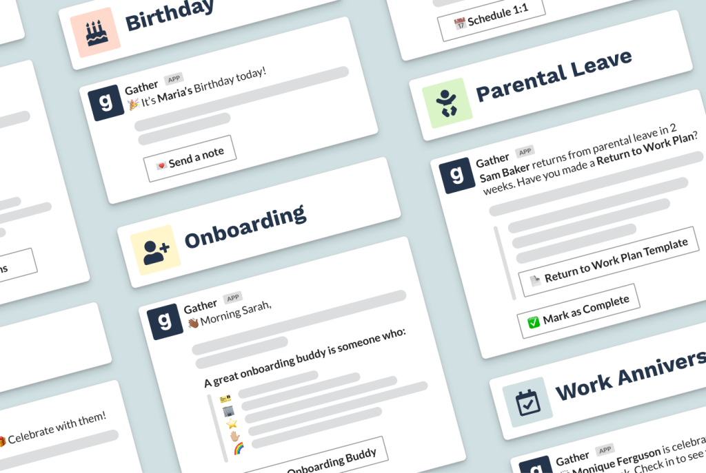 Someone’s five-year work anniversary is approaching? It can remind their manager to drop them a note of congratulations and maybe send a gift. When someone is about to return from parental leave, Gather can ping their teammates to let them know to get ready. Or when someone is leaving the company permanently, it can reach out to the folks who need to know and set up tasks like ensuring their internal accounts are shut off and their equipment is accounted for.