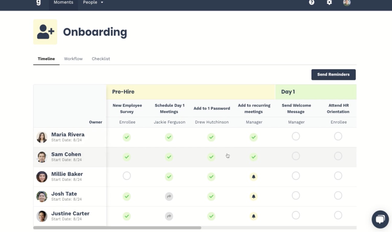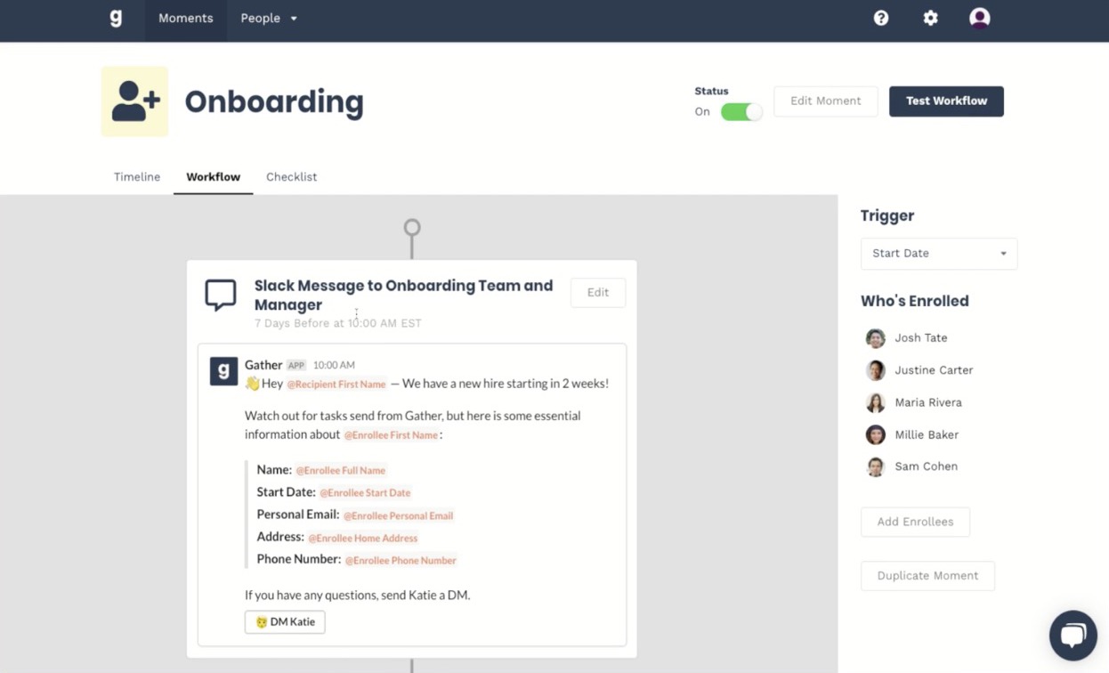 When a new employee is added, for example, it can kick off an onboarding workflow that pings their manager to remind them of their start date, and messages the security team to let them know they’ll need accounts set up. It can help to set up an “onboarding buddy” and send said buddy tips on how to get their new hire up to speed. A few days after the hire’s start date, it can message them to make sure they’ve read through the various orientation documents. It can provide a timeline style overview of to-dos for each employee, letting you quickly check to make sure nothing got skipped along the way — and see who might need a reminder.