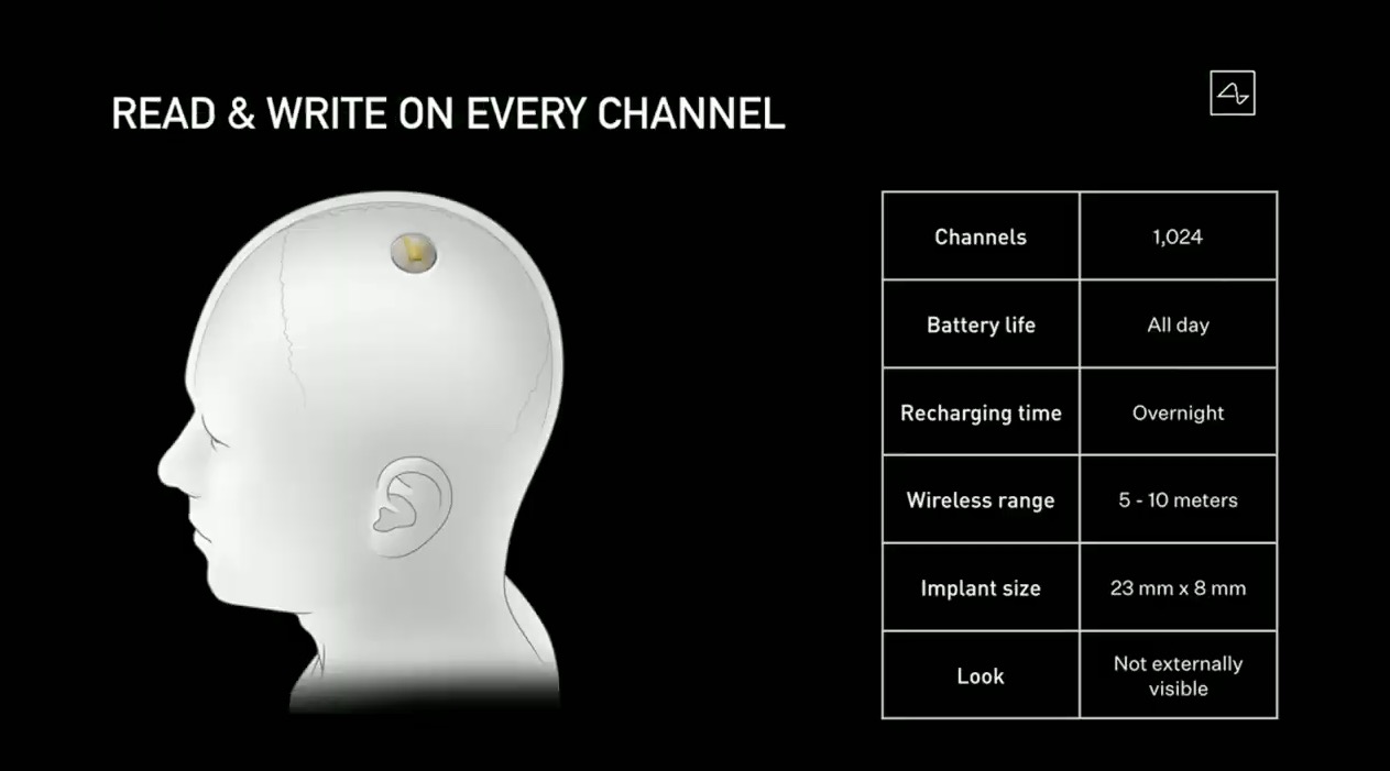 “For the initial device, it’s read/write in every channel with about 1024 channels, all-day battery life that recharges overnight and has quite a long range, so you can have the range being to your phone,” Musk said. “I should say that’s kind of an important thing, because this would connect to your phone, and so the application would be on your phone, and the Link communicating, by essentially Bluetooth low energy to the device in your head.”