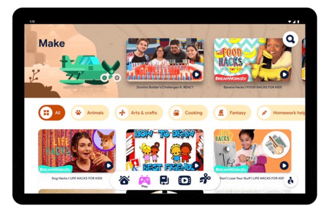 In the Kids Space “Watch” and “Make” tabs, Google is pulling in creative content from YouTube Kids that encourage off-screen activities.