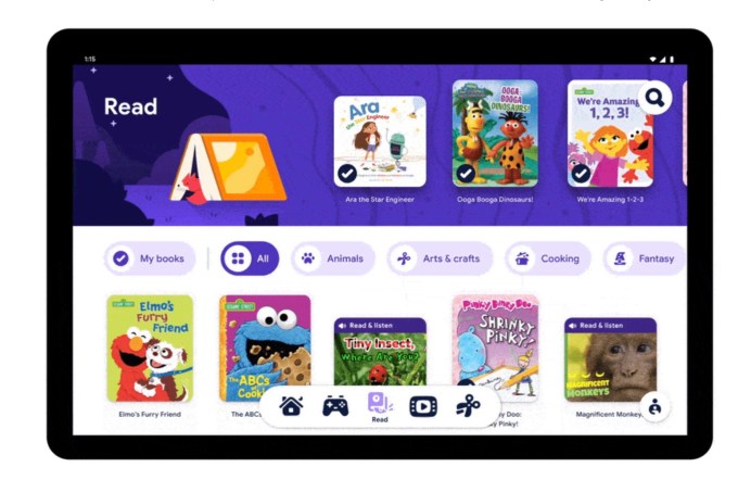 The new Kids Space leverages Google’s earlier work in evaluating Android apps for its “Play” tab, and has expanded its curation to now include other types of quality content. For example, Google worked with publishers to make popular children’s books free of charge in Kids Space, and at launch offers more than 400 free books in the “Read” tab for users in the U.S.