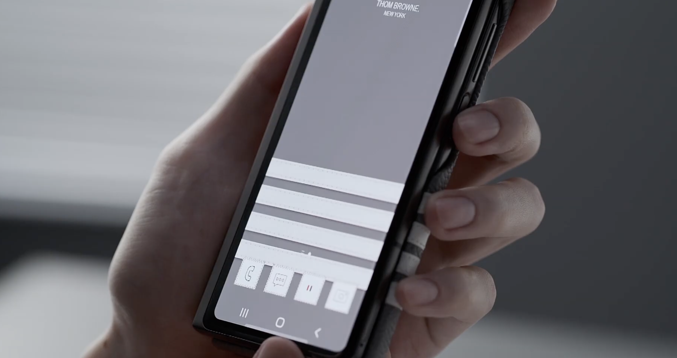 [T]he second release further explores its shared ethos to provide a deeper level of hardware and software integration. The geometric grey and signature multicolor stripe is complemented by a grosgrain pattern, creating a visual texture of fabric on Galaxy Z Fold2’s unique design. Software additions, including a new lock screen and exclusive photo filter, digitize the Thom Browne world and bring a sense of luxury into every interaction.