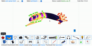 ContactPose provides joint and hand poses for things like game controllers, cameras, bananas and sunglasses, showing contact heat maps and other information useful to a computer trying to figure out how to hold something. You can play around with it here.