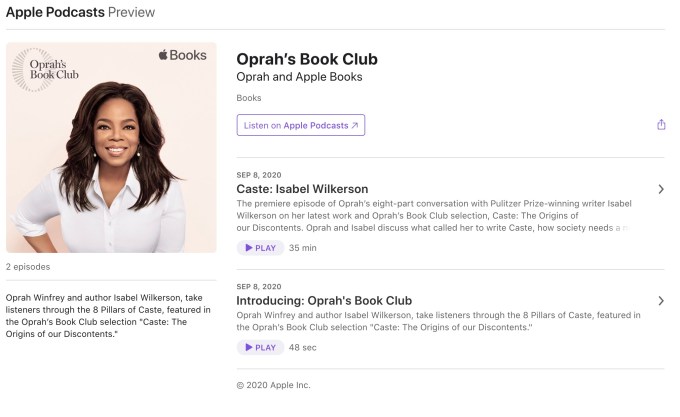 Today, Apple already streams the “Oprah’s Book Club” series on Apple TV+. The company also has a number of ways to cross-market Book Club content. In addition to the new podcast series, for example, customers can also buy Oprah’s book selections on Apple Books, access a discussion guide for the book on Apple Books, and read and listen to an exclusive excerpt from “Caste” on Apple News, among other things. Apple Music Radio (formerly Beats 1) also features an author interview.