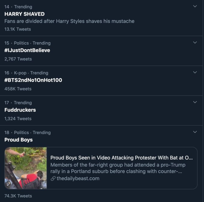 “Proud Boys,” for example, is the No. 17 trend in the U.S. as of the time of writing. But Twitter only links to an article on the site Daily Beast that references a violent clash between the far-right Proud Boys and protestors. It doesn’t tackle trying to explain why this particular article, detailing one of now many incidents of violence across the U.S., is trending. Users, presumably, are meant to infer that the article itself is getting a lot of attention. But in reality, Twitter users are tweeting a variety of content under the “Proud Boys” trend, including their own videos of violent attacks and standoffs.