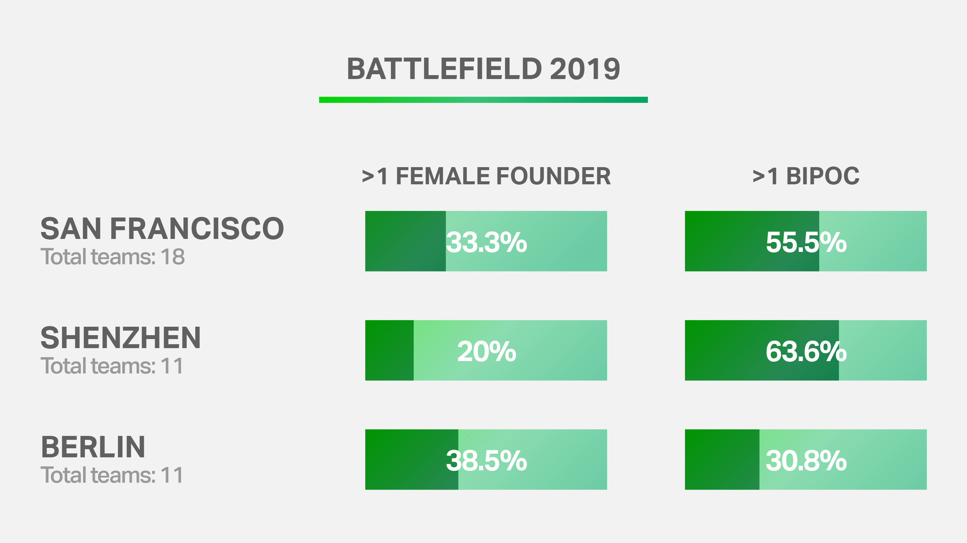 In 2019, we hosted our Hardware Battlefield competition in Shenzhen, which saw 11 companies take the stage and pitch to a panel of judges. Three (27%) of the 11 founders identified as female and seven (64%) identified as a person of color.