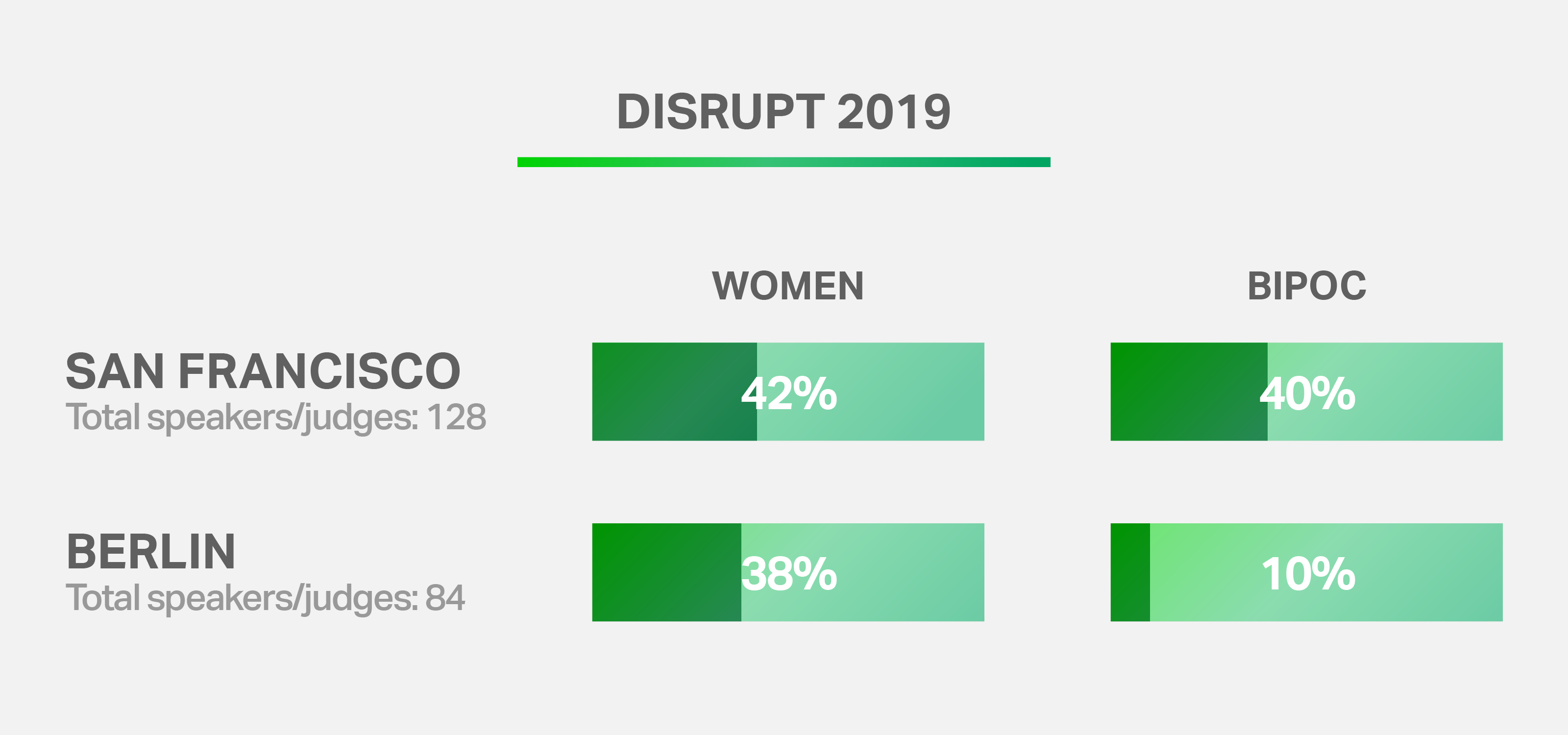 At Disrupt Berlin, of the 84 speakers and Startup Battlefield judges who self-reported, 32 (38%) identified as women and nine (10%) identified as people of color. Of the 13 companies that competed in Startup Battlefield, four (31%) founders identified as a person of color and five founders (38%) identified as female.