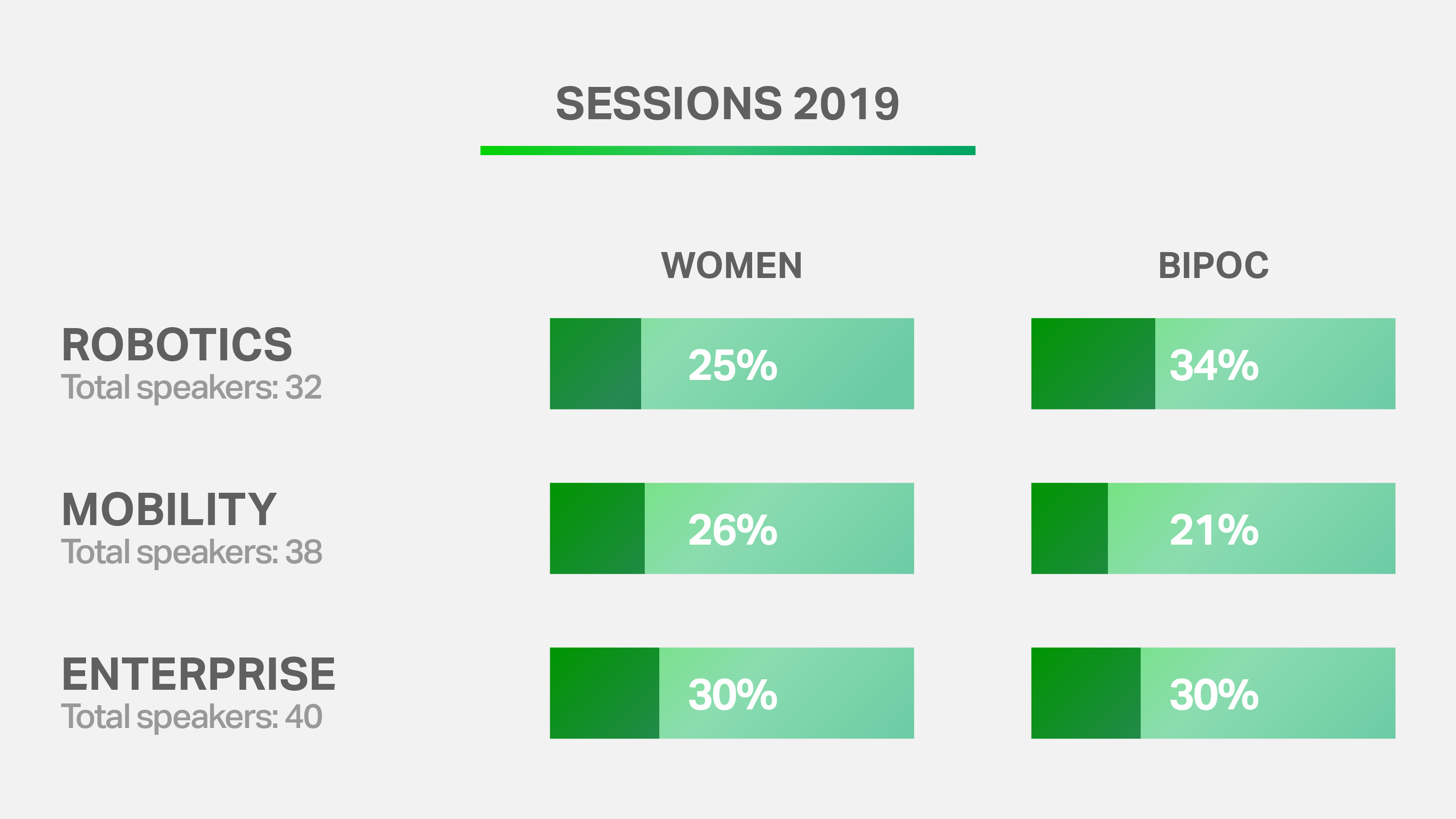 In 2019, we launched TechCrunch Sessions: Mobility in San Jose. Of the 38 speakers who self-reported, 10 (26%) identified as female and 8 (21%) identified as a person of color.