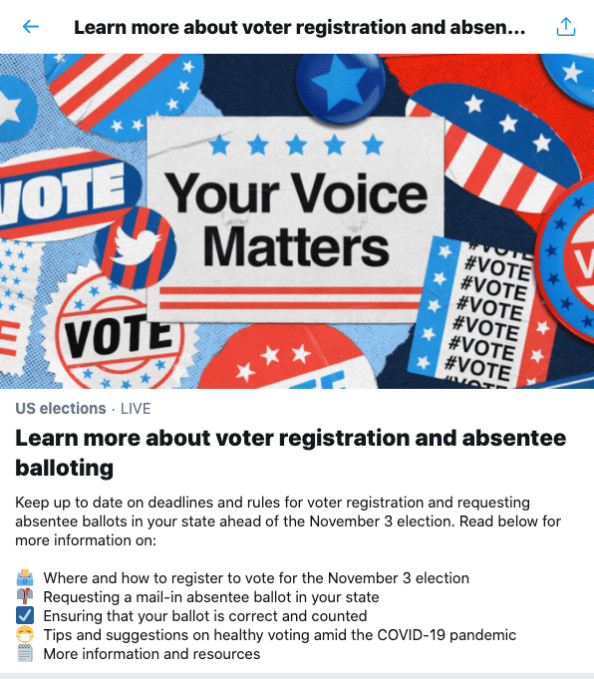 “Twitter wants to empower every eligible person to vote in the 2020 US election, and we’re focused on helping people register, better understand the voting process during COVID-19 including early voting options, and feel informed about the choices on their ballot,” Twitter Public Policy Director Bridget Coyne and Senior Product Manager Sam Toizer wrote in a blog post on the announcement.